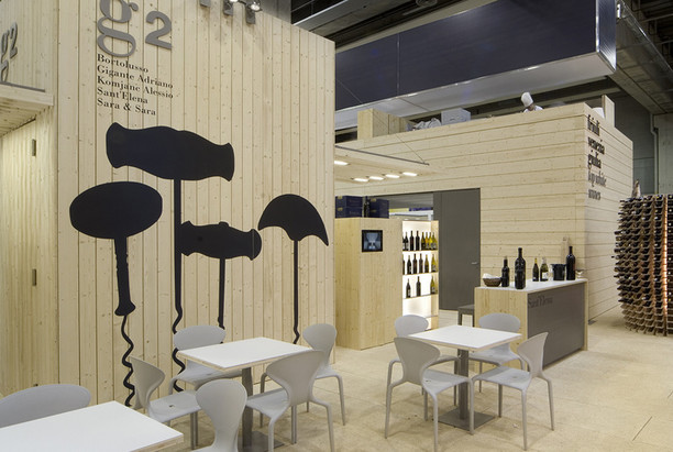 Il progetto dello stand - realizzato in team con l'architetto Monica Armani - ripropone, in un insieme di puro design, alcuni archetipi dell’immaginario e della tradizione del territorio del Friuli Venezia Giulia. Alla pulizia delle linee vengono associati materiali come legno e pietra. Un utilizzo flessibile e una facile adattabilità sono resi possibili da strutture modulari e riconfigurabili. Premiato come migliore stand al Vinitaly.
